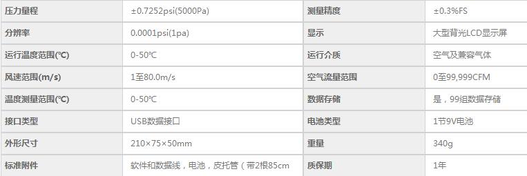·在難以觸及或者密封的地方,可以用皮托管風速計測量風速/風量,而葉片風速計不適合 ·具有最大值/最小值/平均值、相對值、時間戳、數(shù)據(jù)保持和自動關機功能 ·配有大型背光LCD顯示屏 ·具有歸零功能,可實現(xiàn)偏移糾正或測量 ·可在各種模式下保存/調用多達99個讀數(shù) ·配有USB端口,包含軟件 ·5種壓力單位顯示:psi/mBar/mmH2O/inH2O/Pa ·同時顯示壓力,空氣流速或流量及溫度 ·數(shù)據(jù)保持和自動關機功能 ·零偏移校正或測量功能 ·壓力范圍:±0.7252psi ·壓力測量精度;±0.3% ·最大壓力:10psi ·風速測量范圍:1~80m/s ·風速測量精度:±1%FS ·空氣流量測量范圍:0~99999CFM±3% ·溫度測量范圍:0~50℃ ·外形尺寸:210×75×50mm ·重量:340g