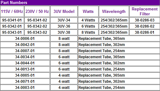 Watts: Four, six or eight watt models UV Source: 254nm, 302nm, 365nm