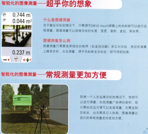 徠卡迪士通D810 touch觸摸屏手持式激光測距儀是世界上唯一一款帶圖像測量的手持激光測距儀。它在不靠近目標的情況下,調(diào)節(jié)D810 touch屏幕上的圖像光標就可以進行遠程測量。圖像測量可以直接測量目標的,長度、寬度、面積、直徑、周長等。