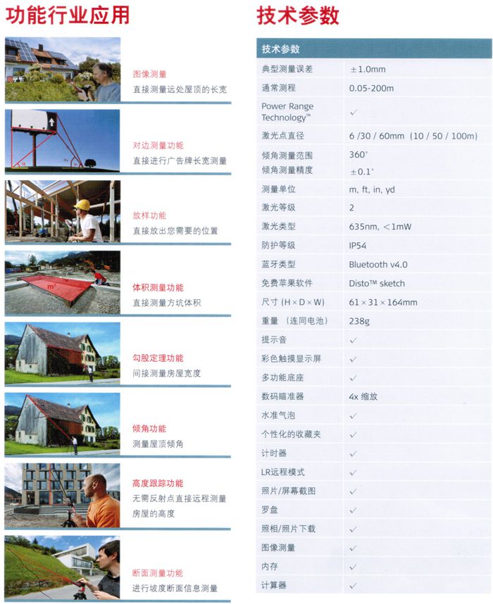 徠卡D810 touch具有高精度羅盤、舒適的彩色觸摸屏、四倍數(shù)碼瞄準器、清晰的數(shù)碼照相功能、鋰電池充電、新一代藍牙4.0、徠卡Sketch軟件等諸多優(yōu)勢。這些功能讓測距儀不再是個工具而是儀器。