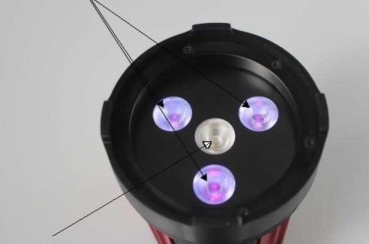 采用3顆大功率紫外LED,照射出光斑更均勻,1顆白光LED。